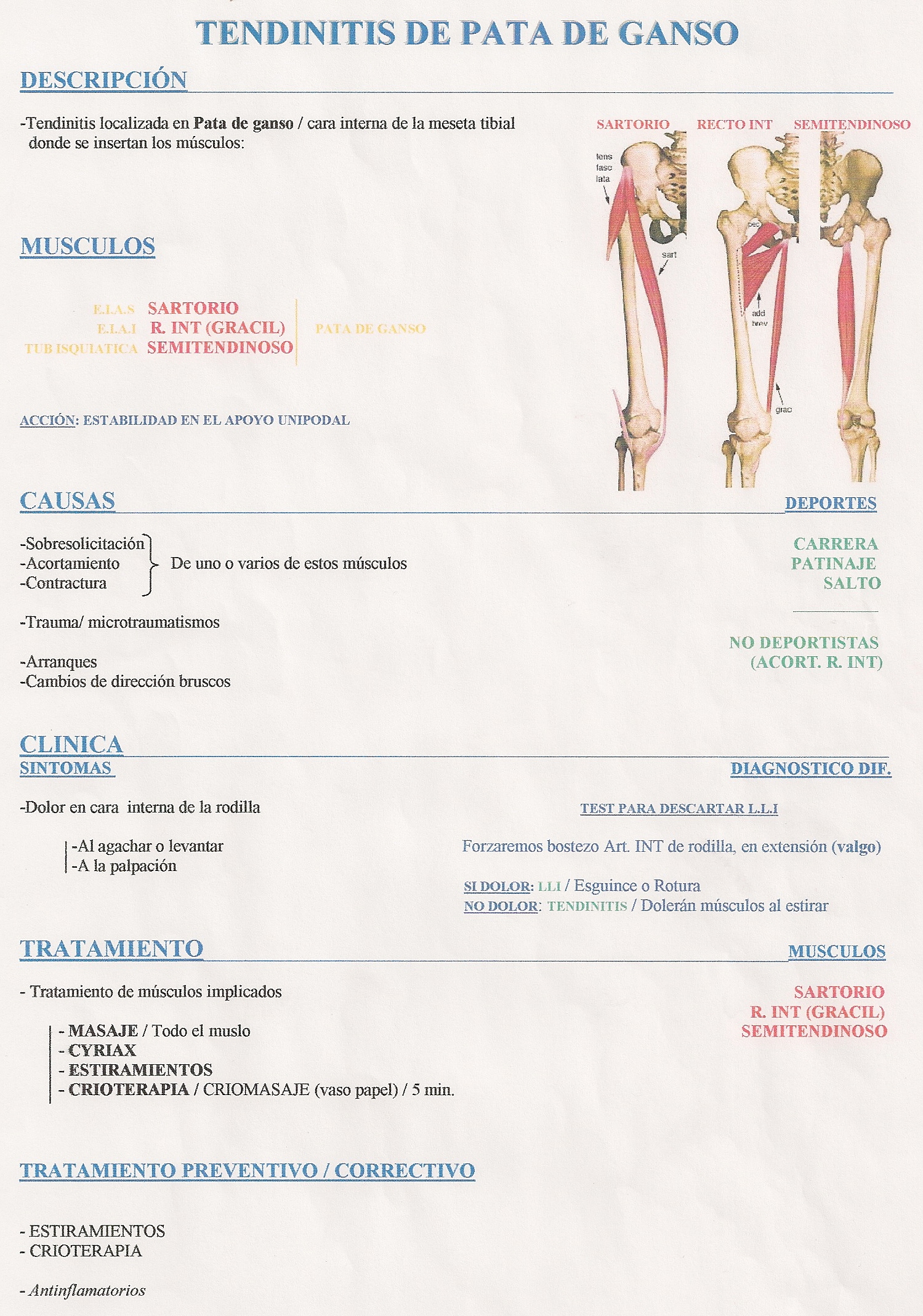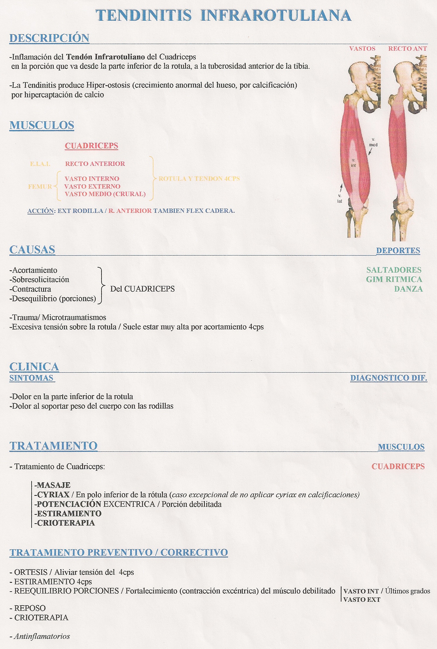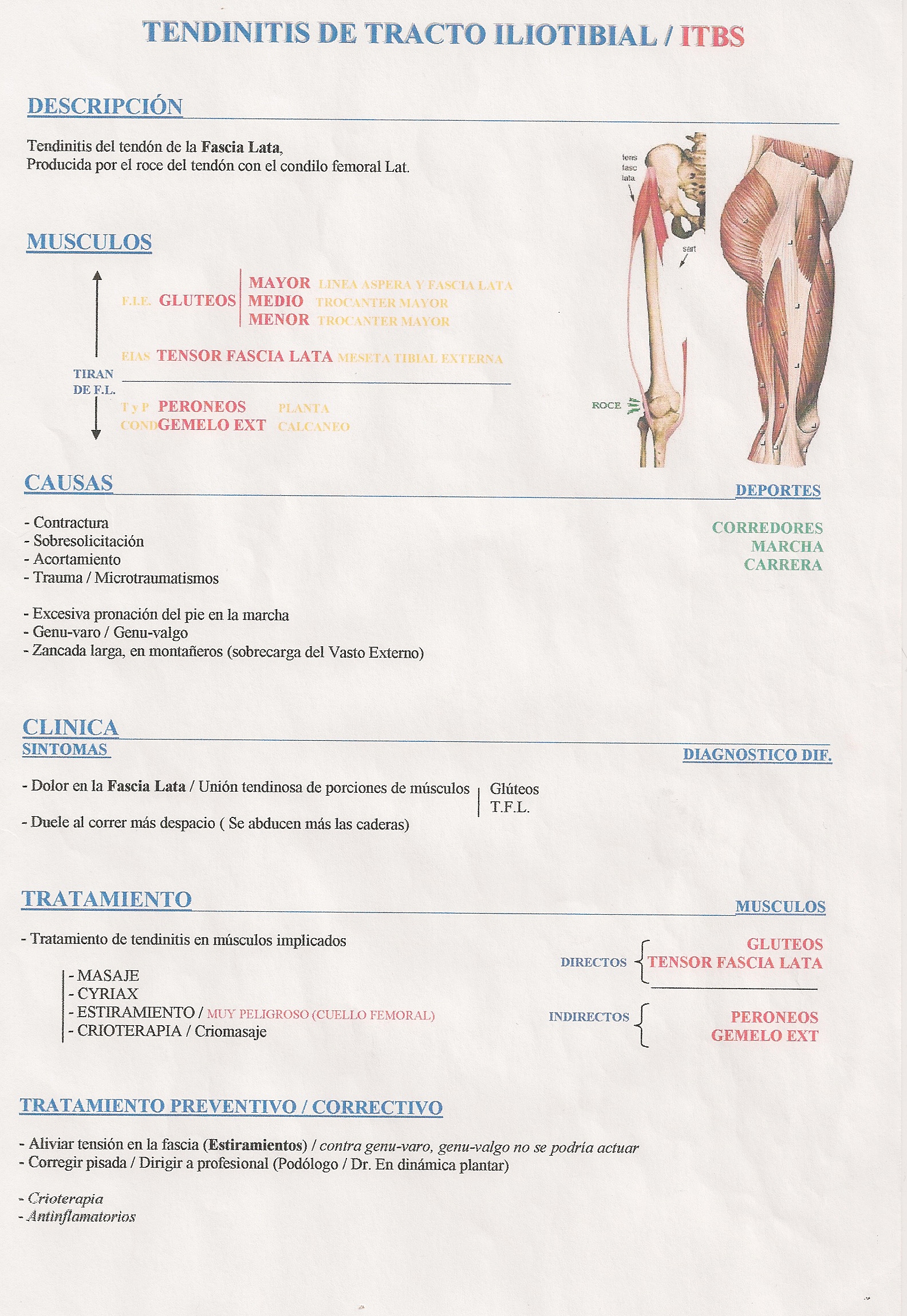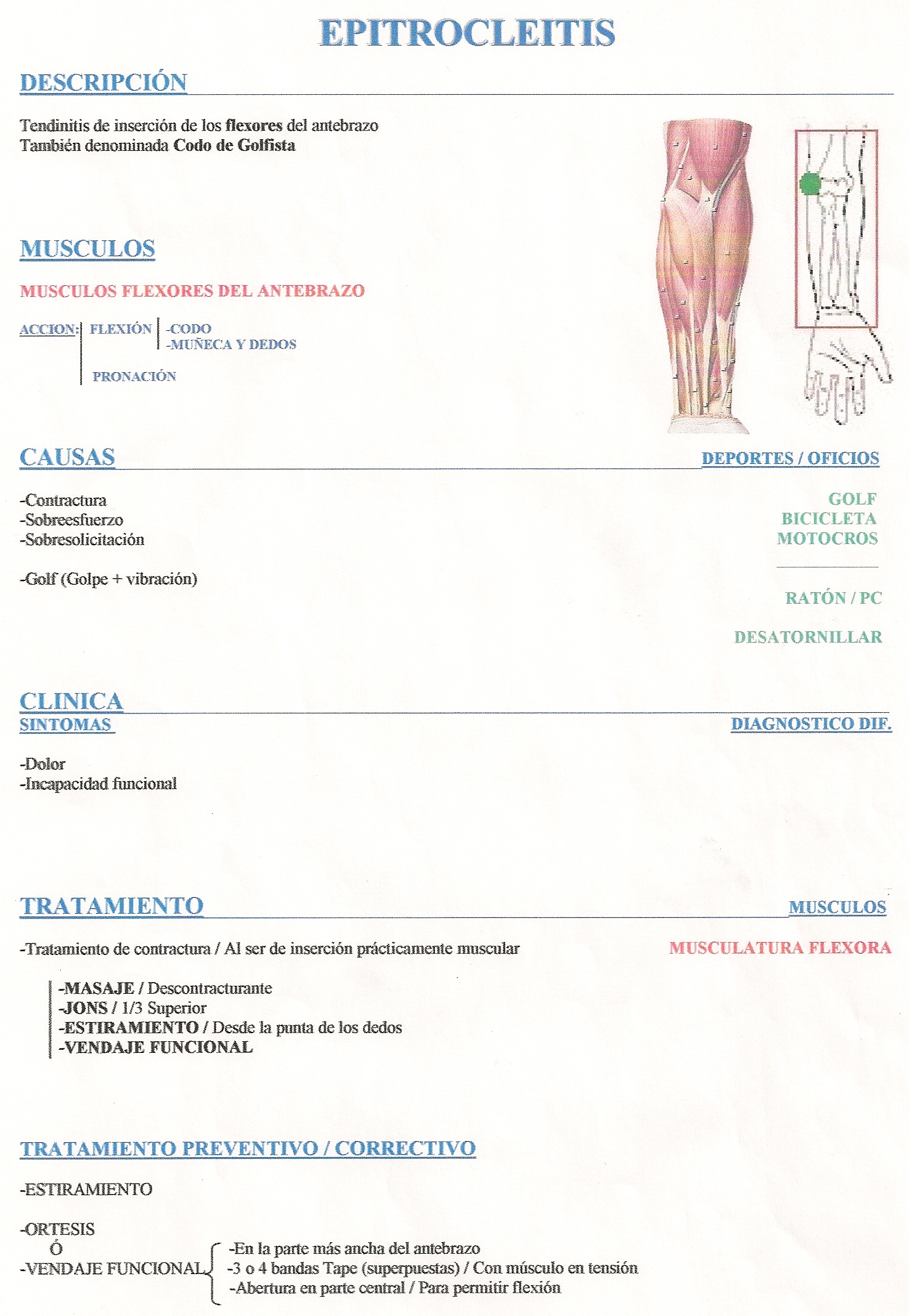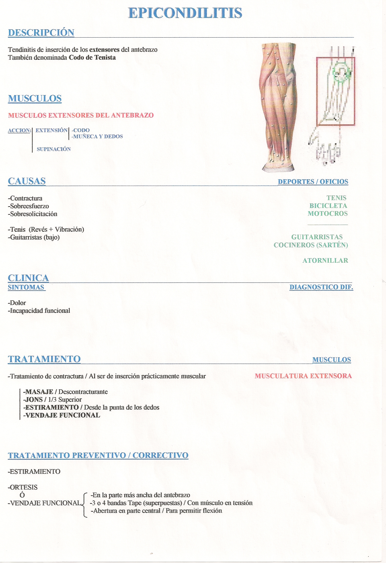 - TENDINITIS - * EPICONDILITIS (CODO DE TENISTA). * EPITROCLEITIS (CODO DE GOLFISTA). * MANGUITO DE LOS ROTADORES. * TENOSINOVITIS DE QUERVAIN. * TENDINOPATIA BICIPITAL EN RADIO. * TENDINOPATIA AQUILEA. * TENDINOPATIA DE PATA DE GANSO. * ITBS (TENDINOPATIA DE FASCIA LATA). *TENDINOPATIA ROTULIANA. * TROCANTERITIS. * PUBALGIA. | - OTRAS - * CONTRACTURA. * CERVICALGIA. * LUMBALGIA. * ESGUINCE. * CONDROMALACIA. * SINDROME DEL TUNEL CARPIANO. * FASCITIS PLANTAR. * PERIOSTITIS. * TALALGIA. |